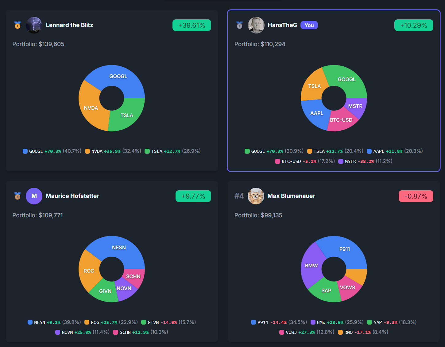 - Watch the competition heat up. A live leaderboard shows who's winning with real portfolio metrics — updated daily.
